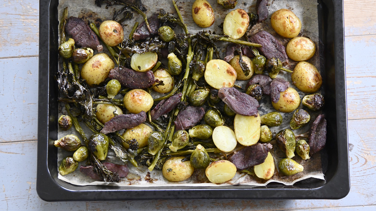 Mehevä riistaliha ja värikkäät vihannekset yhdellä pellillä on arkiruokaa parhaimmillaan. Tässä ei ole tiukkoja sääntöjä, eli uuniin sitä mitä kotoa löytyy!