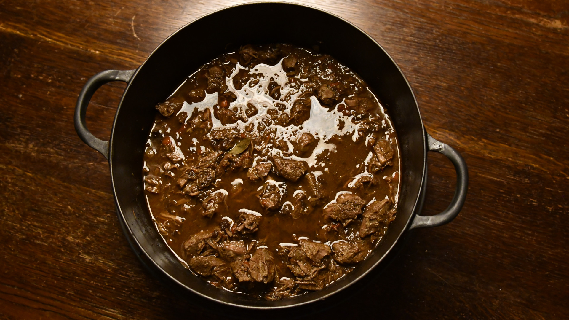 Lisää vesi, luumut, laakerinlehdet, punaviinietikka ja suola. Anna hautua 2–3 tuntia miedolla lämmöllä kunnes liha on mureaa. Lisää vettä haudutuksen aikana tarvittaessa, jotta liha on nesteen peitossa.